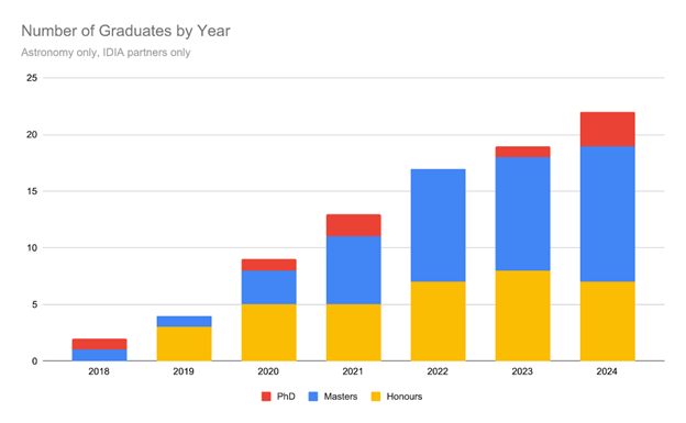Number of graduates by year (2018 – 2024) for astronomy postgraduate students at IDIA partner universities.