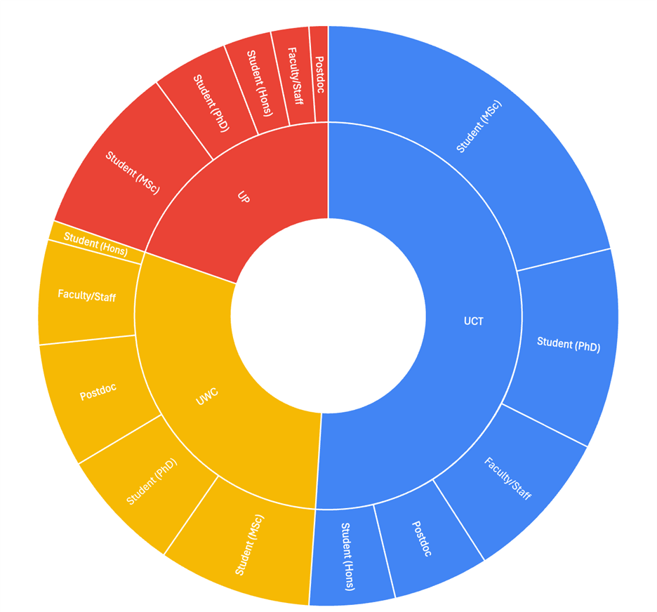 Chart of ilifu astronomy users (faculty/staff, postdoctoral fellows and postgraduate students) at IDIA-partner institutions.