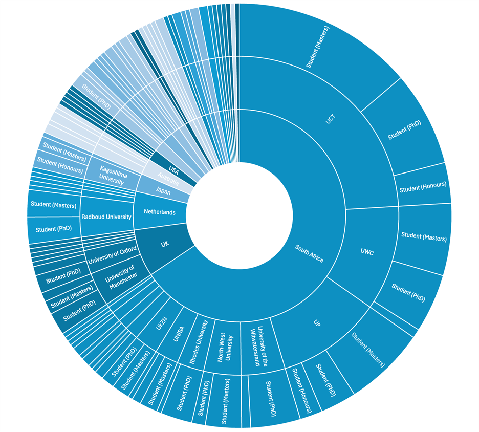 Graduated*: covers the period of 2018-2024 and includes PhD, MSc and Hons students. Other South Africa (Astronomy): NWU (11), RU (11), SAAO (3), SU (5), UFS (4), UJ (1), UNISA (6), UKZN (6), UNIVEN (3), Wits (15). Other Africa (Astronomy): Ethiopia (2), Mauritius (2), Madagascar (2), Kenya (2), Benin (1), Zambia (1). Other International (Astronomy): Australia (11), Canada (3), China (5), France (3), Germany (7), India (3), Israel (2), Italy (6), Japan (9), Netherlands (19), New Zealand (1), Spain (3), Sweden (1), UK (26), USA (8). Other South Africa (Bioinformatics): CPUT (2), RU (2), SAMRC (1), SANBI (1), SPU (1), SU (25), UJ (1), UFS (2), Wits (1). Other Africa (Bioinformatics): Botswana (1), Ghana (3), Kenya (1), Mauritius (1), Morocco (1), Nigeria (4), Uganda (2). Other International (Bioinformatics): USA (2)